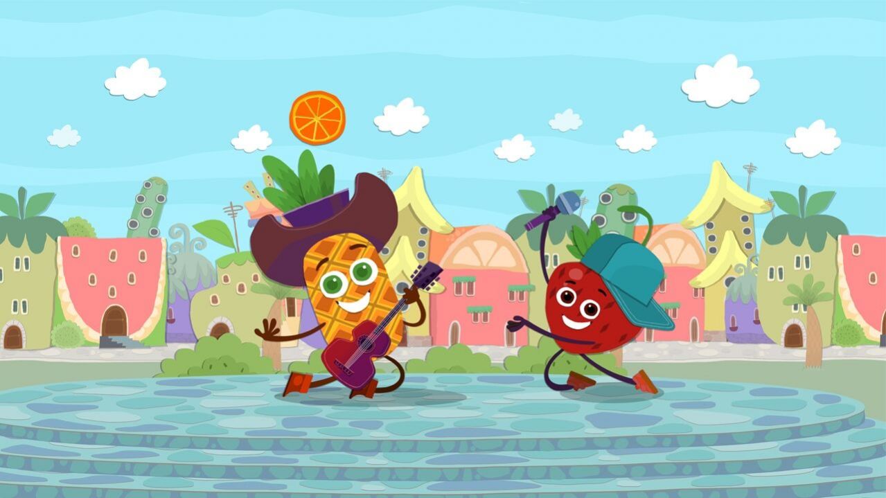 תותי פרוטי - פרק 7 תוכנית מוסיקלית מדליקה עם הרכב נגנים המורכב כולו מפירות משעשעים שמרקידים את הקטנטני. כ' עב'. מדובב. ש.ח.